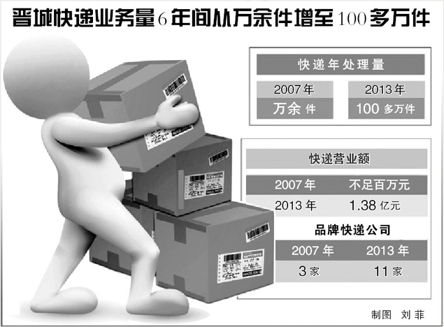 “韵达速递是2007年进入晋城市场的,属于比较早的一批,当时还只有为数不多的一两家快递公司,刚开始每天也就是几十单货物,到2013年每天达到了3000多单,仅11月份揽件就达1万多件,派件更是达到了12万件。”韵达速递公司经理常丽说。