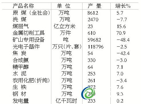 È«ÄêÈ«Éç»áÔú²úÁ¿8612Íò¶Ö£¬Ôö³¤5.7%£»¹æÄ£ÒÔÉϹ¤Òµ·¢µç233ÒÚǧÍßʱ£¬Ôö³¤0.2%£»Ë®Äà253Íò¶Ö£¬Ôö³¤7.0%£»Å©Óû¯·Ê£¨ÕÛ´¿£©261Íò¶Ö£¬Ï½µ3.4%£»½¹Ì¿54Íò¶Ö£¬Ï½µ42.4%£»¸Ö²Ä²úÁ¿299Íò¶Ö£¬Ôö³¤9.3%£»ÉúÌú372Íò¶Ö£¬Ôö³¤7.6%¡£
