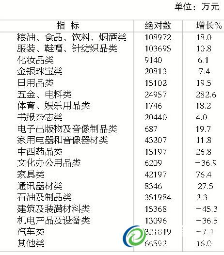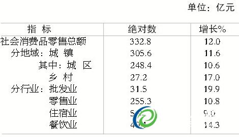È«ÄêÈ«ÊÐÉç»áÏû·ÑÆ·ÁãÊÛ×ܶî332.8ÒÚÔª£¬Ôö³¤12.0%¡£°´¾ÓªµØÍ³¼Æ£¬³ÇÕòÏû·ÑÆ·ÁãÊÛ¶î305.6ÒÚÔª£¬Ôö³¤11.6%£»Ïç´åÏû·ÑÆ·ÁãÊÛ¶î27.2ÒÚÔª£¬Ôö³¤17.0%¡£