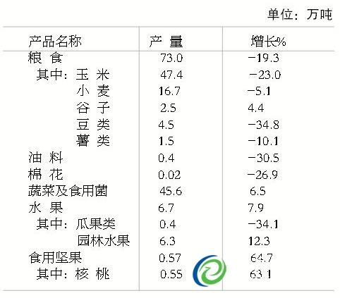 È«ÄêÁ¸Ê³²úÁ¿73.0Íò¶Ö£¬¼õÉÙ17.5Íò¶Ö£¬¼õ²ú19.3%¡£ÆäÖУ¬ÏÄÁ¸16.7Íò¶Ö£¬¼õ²ú5.1%£»ÇïÁ¸56.3Íò¶Ö£¬¼õ²ú22.8%¡£