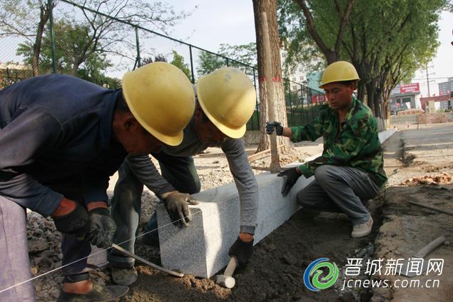 工人在抓紧铺设路沿石。本报记者 张理锋 摄