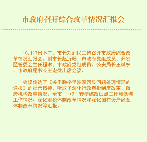 10月17日下午,市长刘润民主持召开市政府综合改革情况汇报会。副市长赵沂旸,市政府党组成员、开发区管委会主任程琳,市政府党组成员、公安局长王斌权,市政府秘书长王宏微出席会议。...